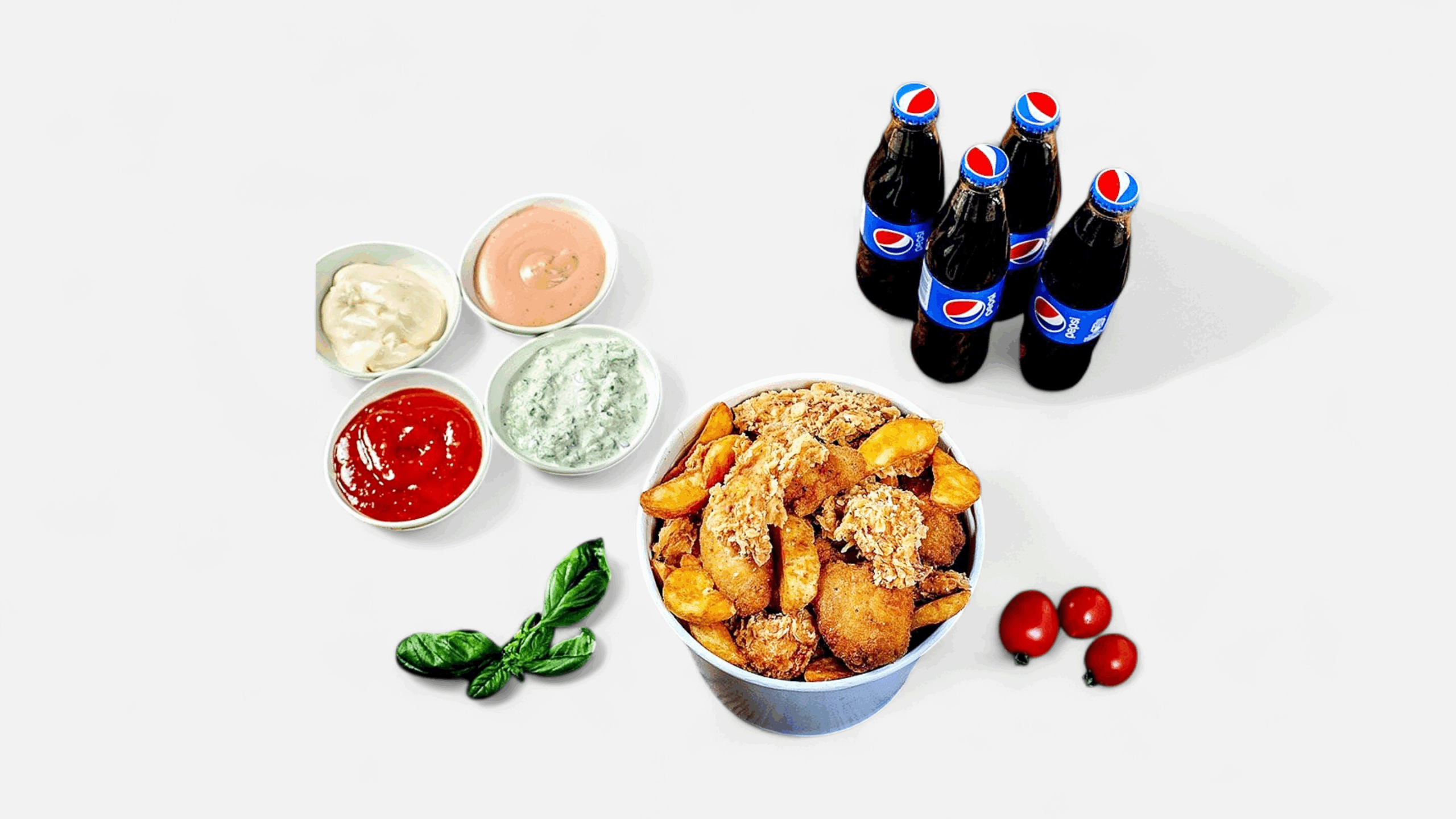 INGREDIENTE: crispy pui, cartofi pai/wedges, 4 sosuri la alegere, 4 Pepsi sticlă 0.25L