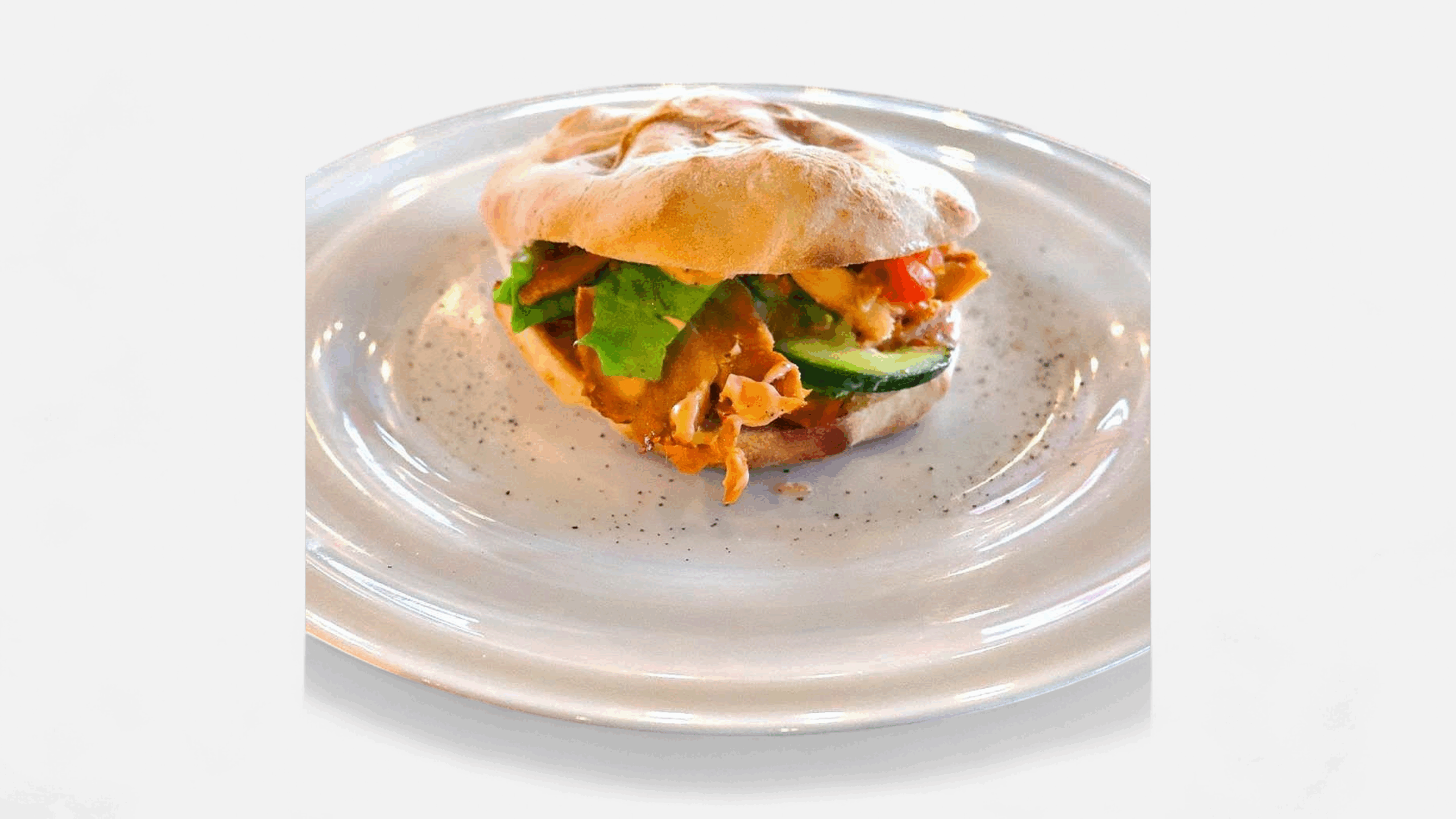 INGREDIENTE: pită pe vatră, carne de pui rotisată, cartofi pai, salată verde, roșii, castraveți, sos cocktail