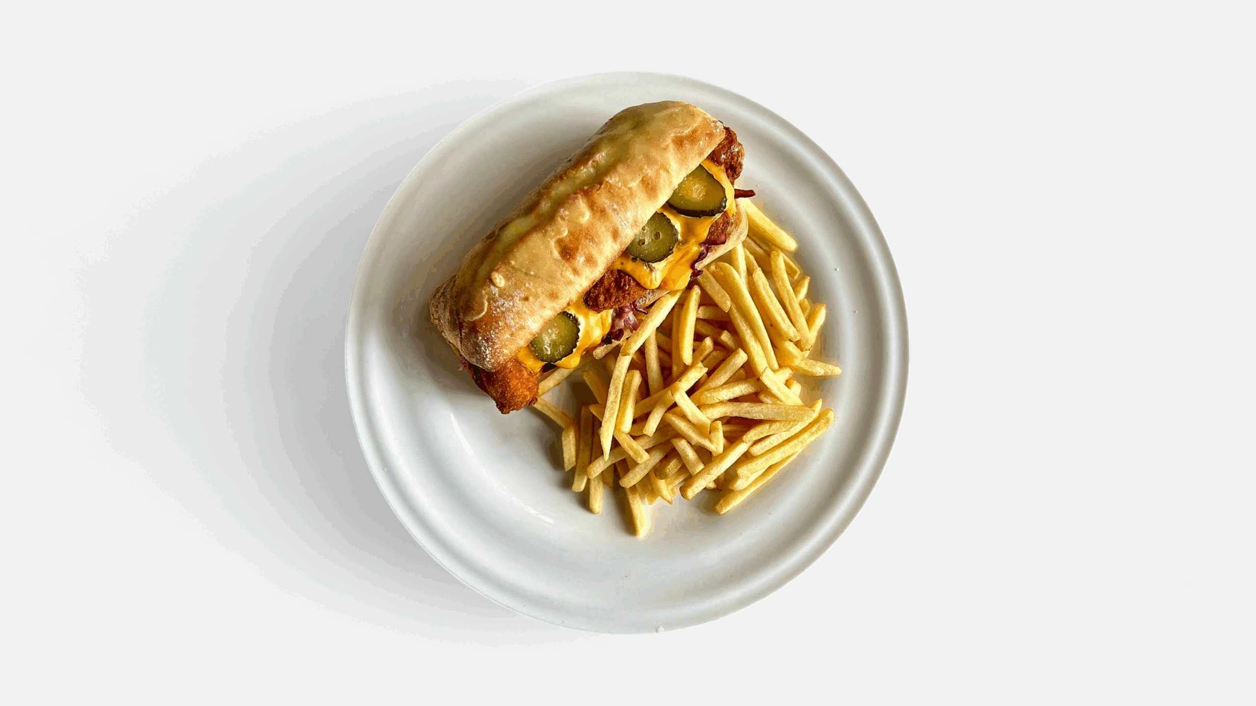 Ingrediente: paine ciabatta 120gr, pui crocant 140gr, salata coleslaw 70gr, castraveti murati 30gr, sos cheddar 50gr ,cartofi pai 200gr