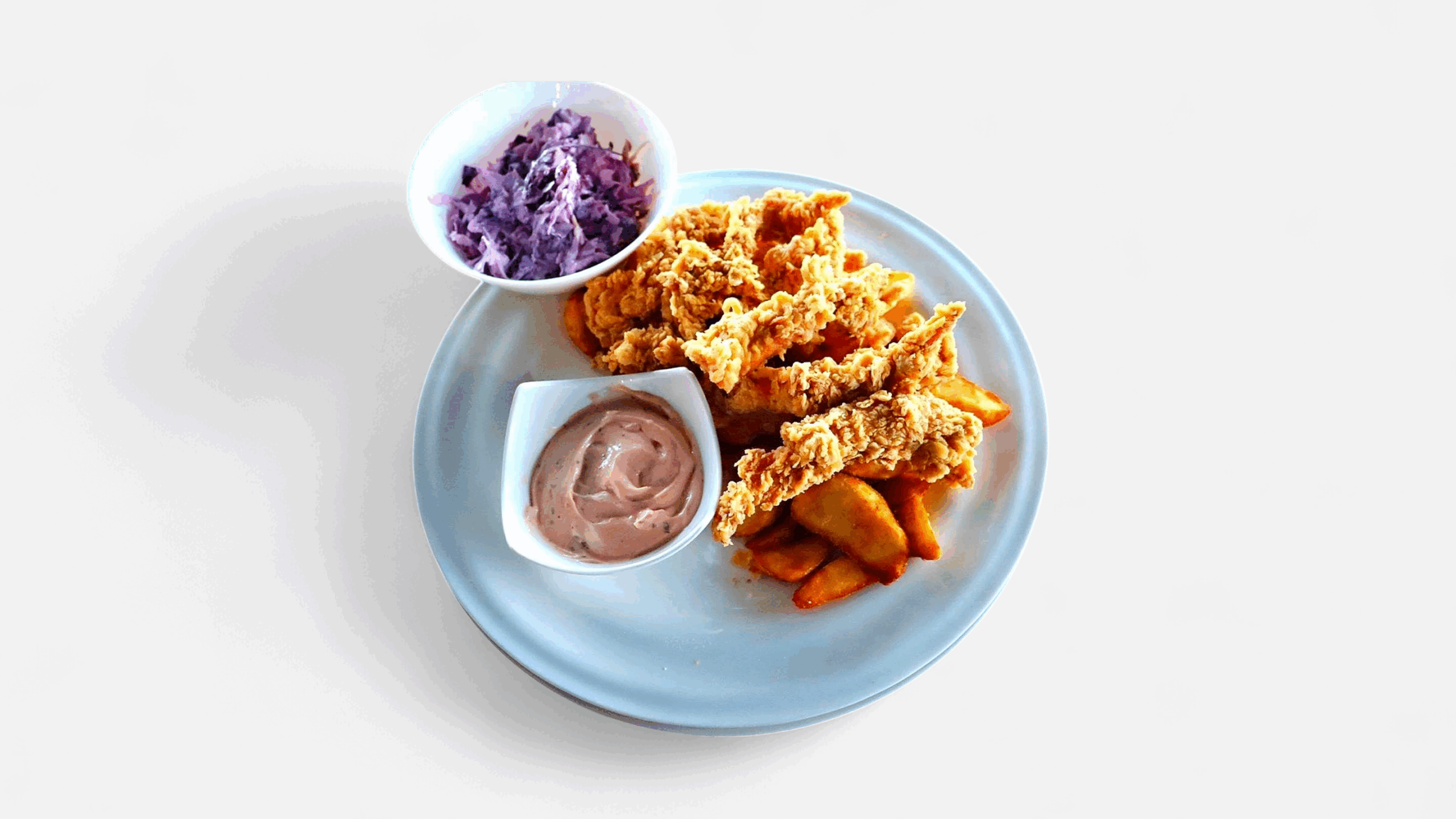 INGREDIENTE: crispy pui, cartofi wedges, salată coleslaw, sos cocktail