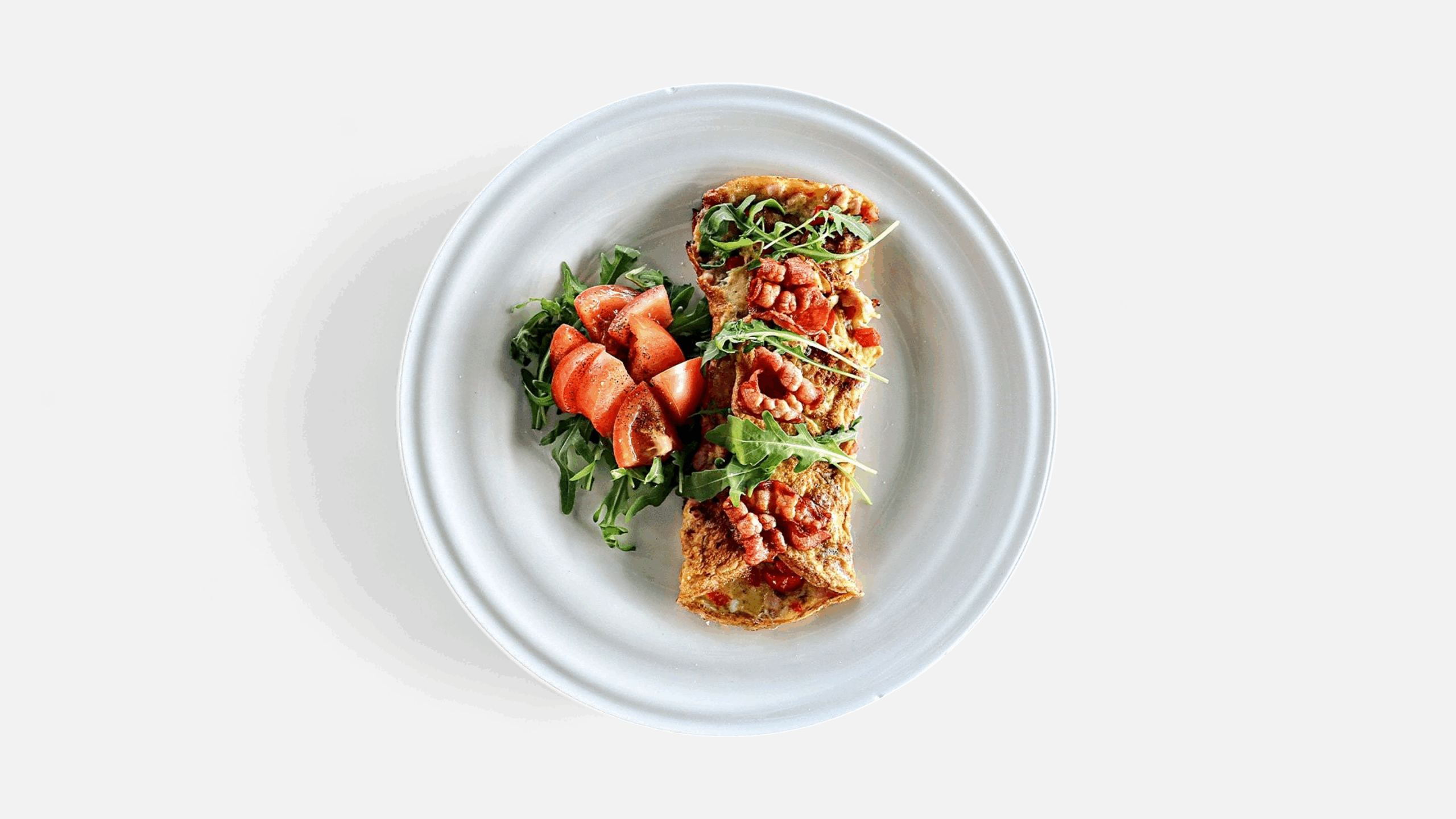 INGREDIENTE: 2 ouă, pastramă, ceapă roșie, ardei kapia, roșii, salată verde, pâine prajită
