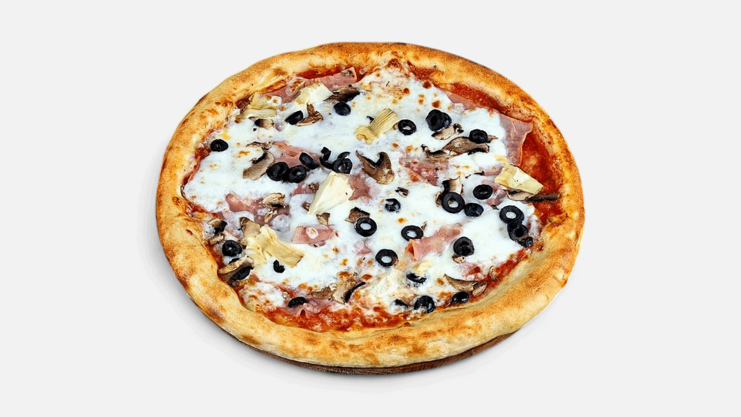 INGREDIENTE: blat, sos pizza, mozzarela, prosciutto cotto, anghinare, ciuperci, măsline