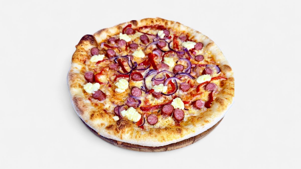 blat, sos pizza, mozzarella, cabanos, ceapa rosie, ardei gras, branza burduf