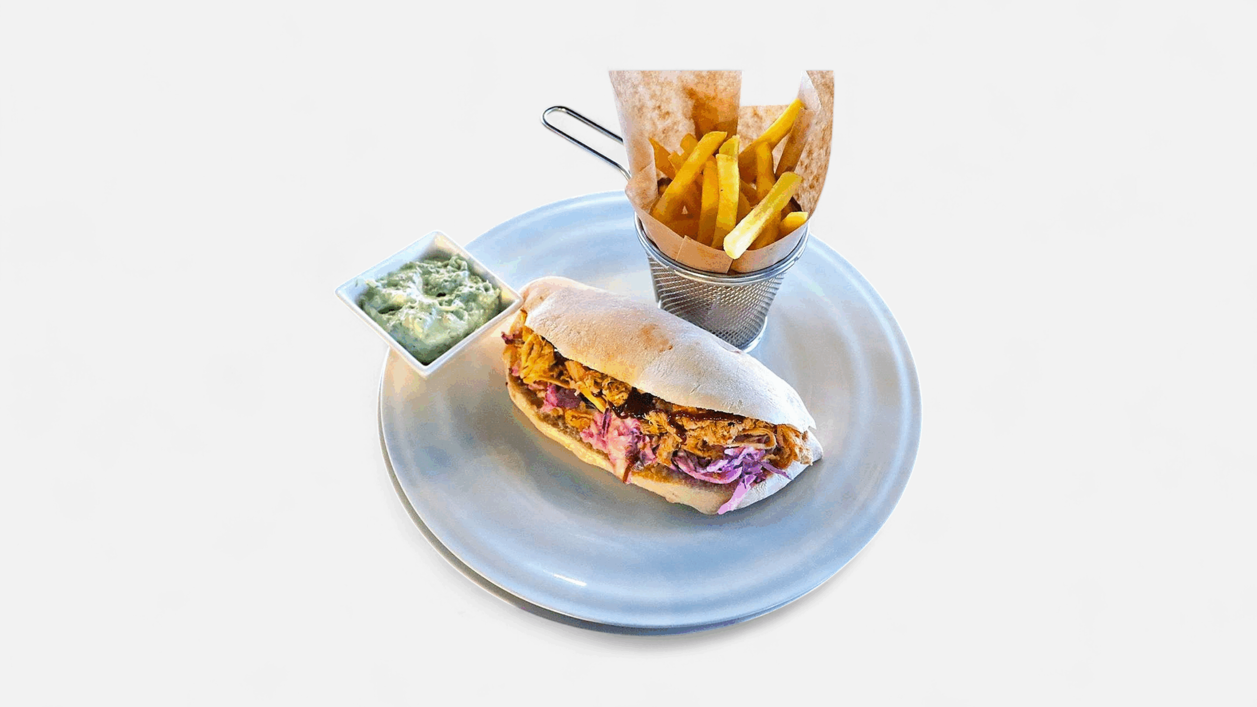 INGREDIENTE: pită pe vatră, pulpă de porc, sos californian, salată coleslaw ,dulceață de ceapă, cartofi pai, sos green