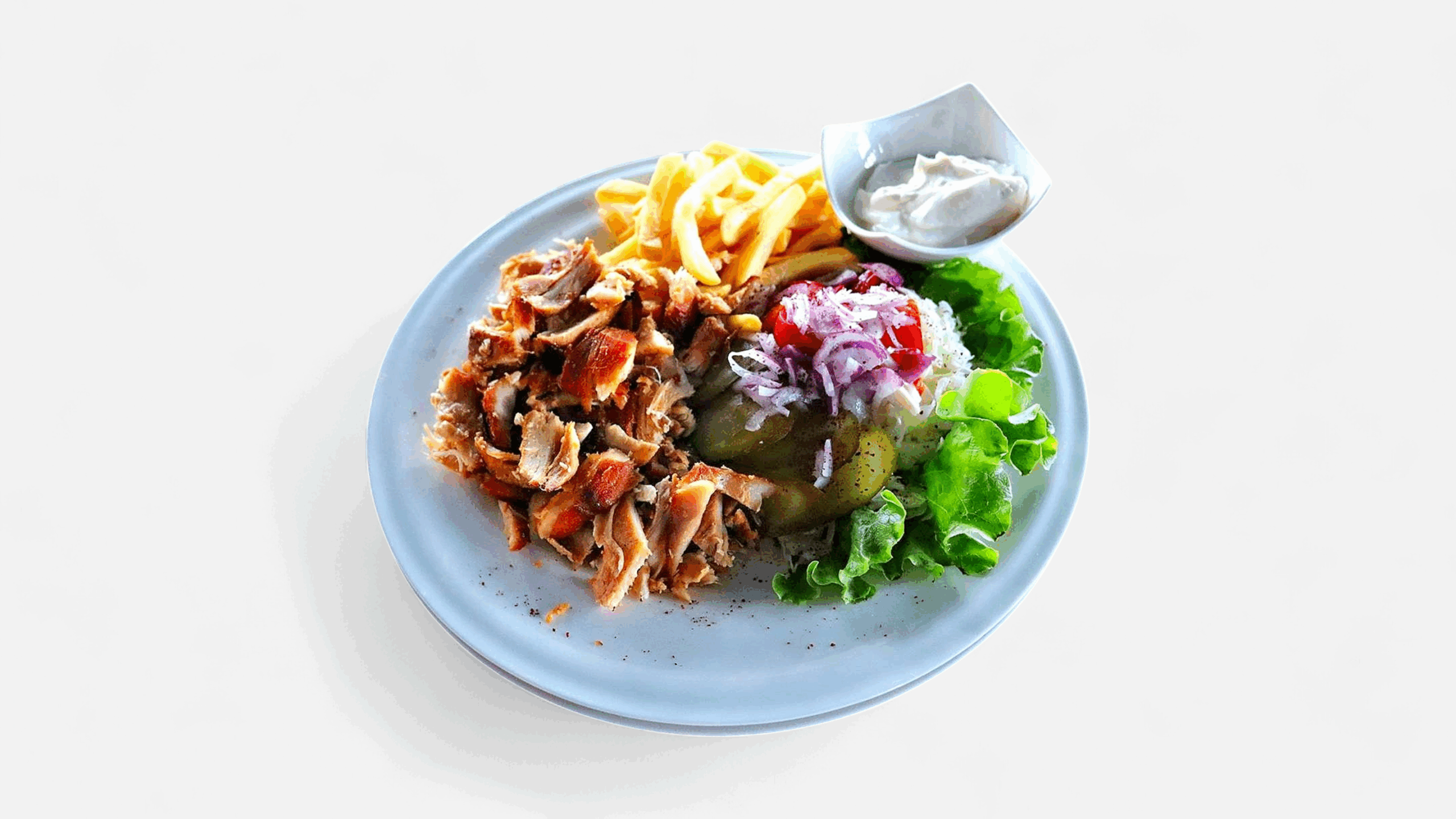 INGREDIENTE: carne pui rotisată, cartofi pai, salată varză albă, castraveți murați, gogoșari, ceapă roșie, maioneză de casă cu usturoi