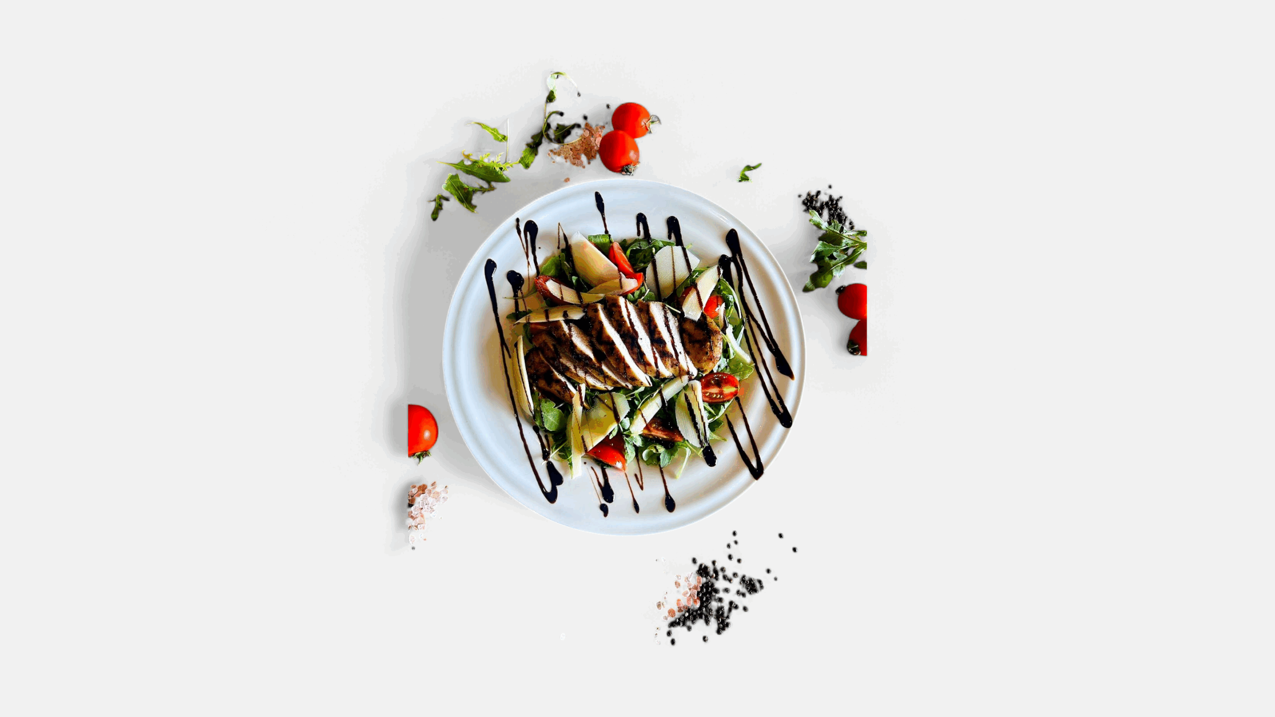 Ingrediente: salata de rucola cu rosii cherry, scale de parmezan și otet balsamic, piept de pui marinat. Alergeni: lactoza